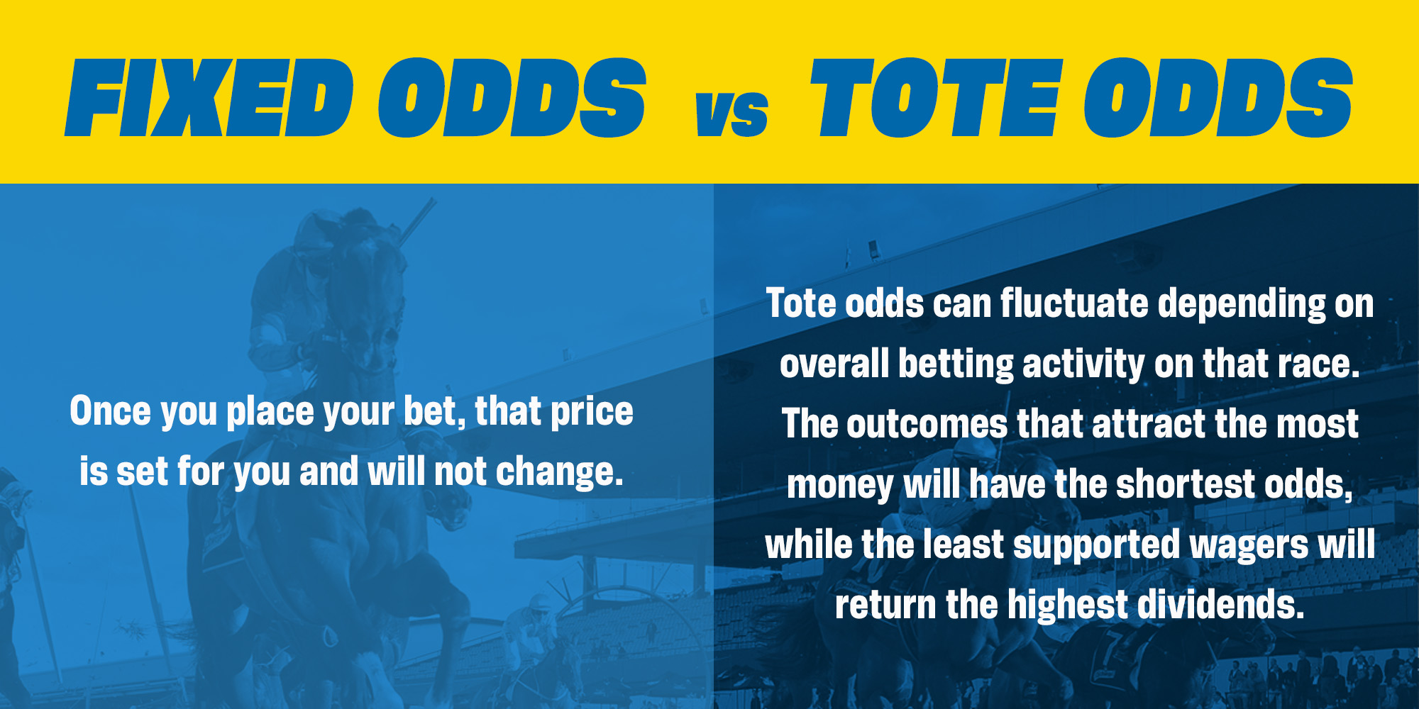 <p>Choosing between fixed or tote odds comes down to the punter. However, in racing there are certain bets such as <a href="https://www.sportsbet.com.au/huddle/punter-iq/guide/what-is-a-trifecta">Trifectas</a> and <a href="https://www.sportsbet.com.au/huddle/punter-iq/guide/what-is-a-quaddie">Quadrellas</a> whose odds are determined exclusively by the tote.</p>